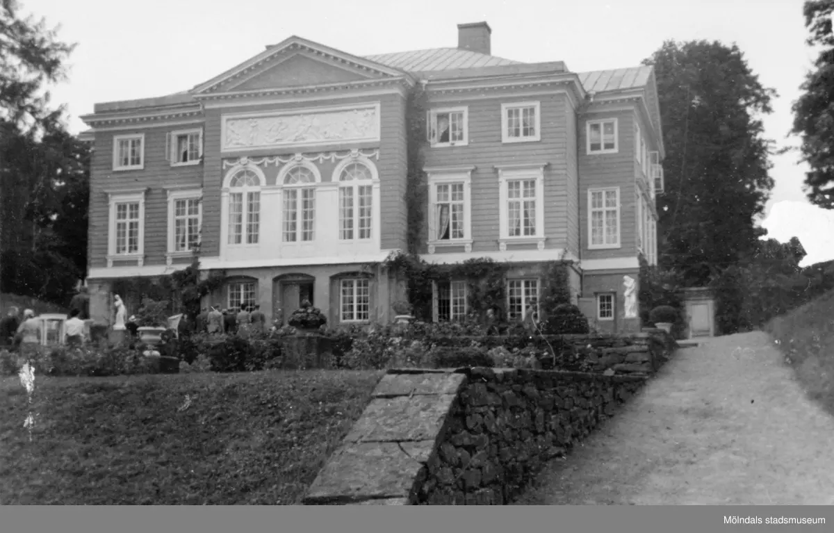 Trädgårdsarkitektbesök på Gunnebo slott den 26 augusti 1939. Exteriör från söder. Slottsbyggnaden syns utan altan med balustrad och trappor ned till trädgården. Dessa togs bort i slutet av 1800-talet, men återuppfördes i sten 1955-1956.