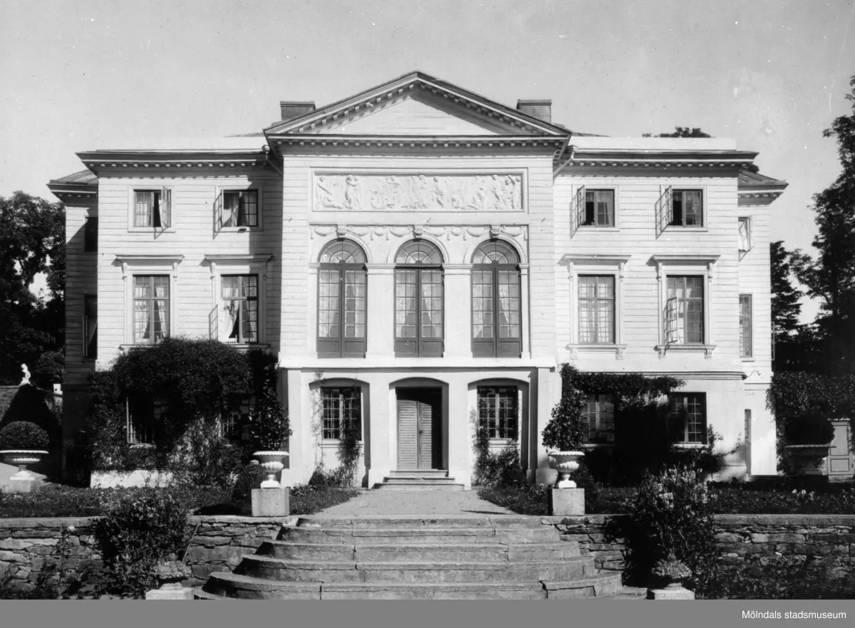Gunnebo slott sett från söder, 1930-tal. Slottsbyggnaden syns utan altan med balustrad och trappor ned till trädgården. Dessa togs bort i slutet av 1800-talet, men återuppfördes i sten 1955-1956.