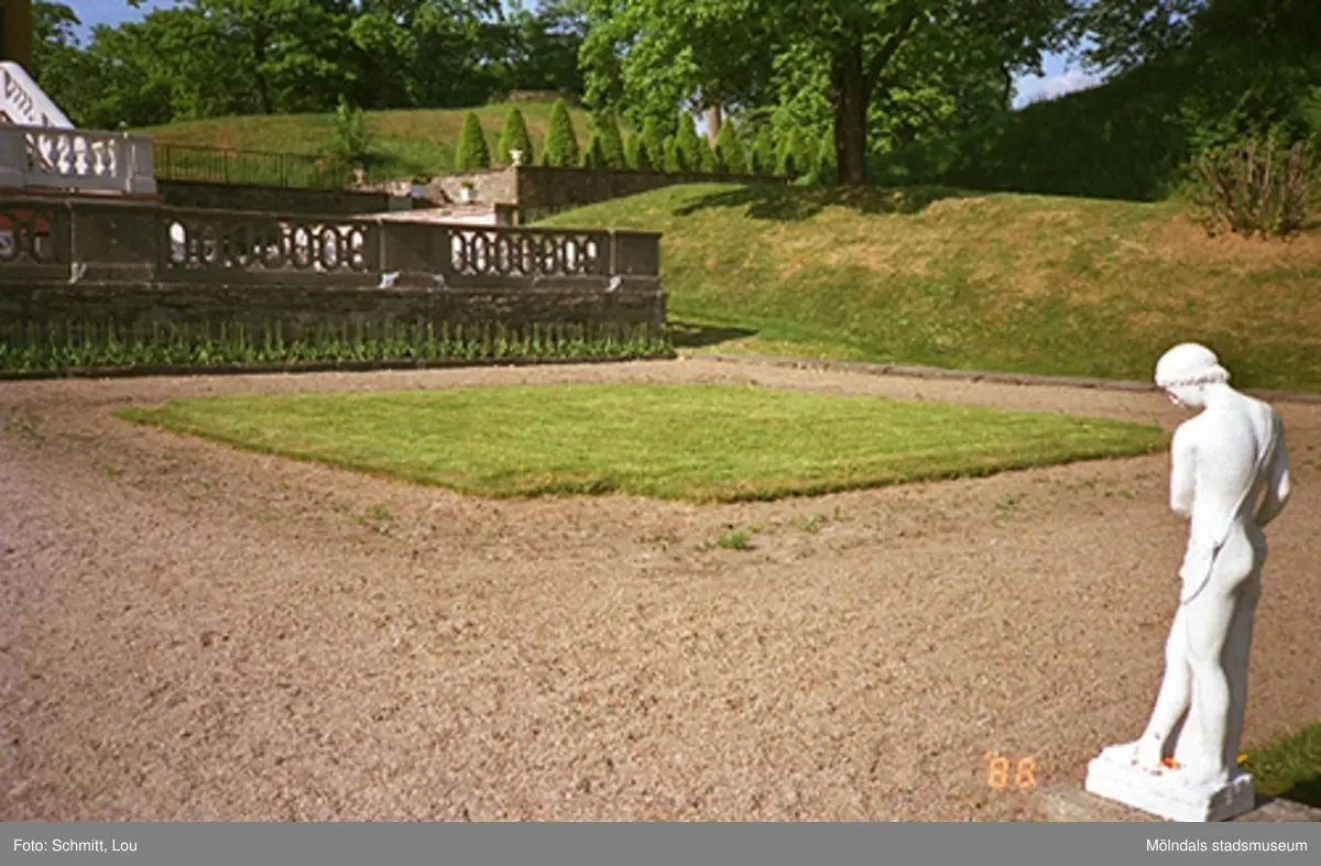 Till höger i bild ser man en vit staty av en naken man. Framför statyn ligger en grusplan samt en gräsplätt. Till vänster skymtar man sten-staketet som tillhör högra framdelen av slottets entré. Vid sidan om detta ser man en rad av sockertoppsgranar.