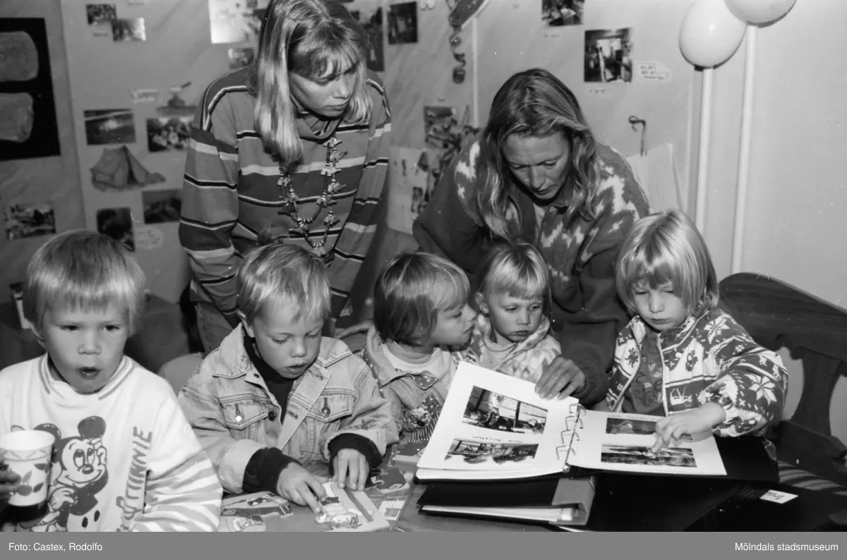 Fem barn och två vuxna pysslar eller tittar i fotoalbum. Utställningsvernissage av och om Katrinebergs daghem på Mölndals museum 1993-09-10.