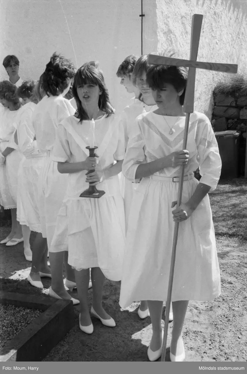 Titel: Konfirmation i Kållereds kyrka, år 1984. Ungdomarna utanför Almrothska koret. För mer information om bilden se under tilläggsinformation.