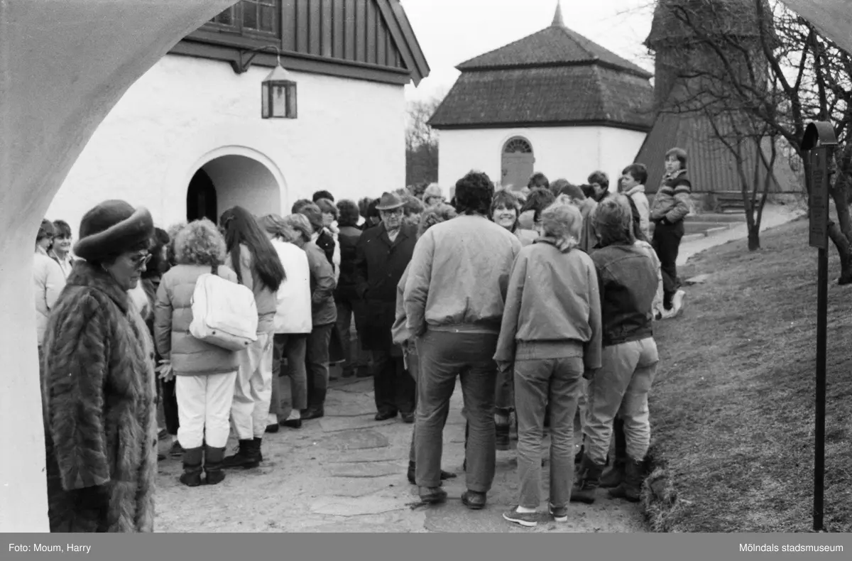 Gospelkören Seier från Mölndals vänort i Norge gästar Kållered, år 1984. Vid Kållereds kyrka. "Dags för hemresa. Gresvik och Kållereds-ungdomarna tar farväl."