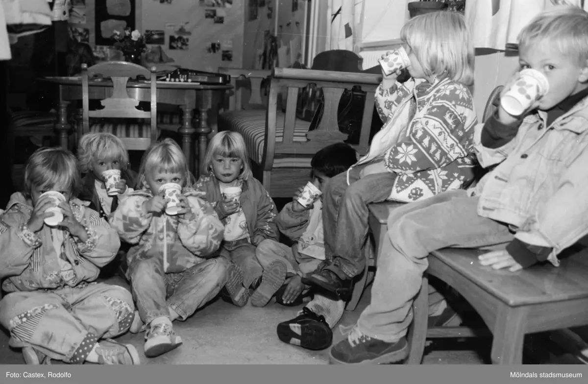 Barn sitter samlade och fikar i samband med en utställningsvernissage av och om Katrinebergs daghem på Mölndals museum 1993-09-10.
