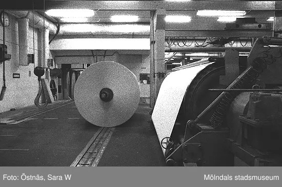 Bilden visar en skymt av KM 3, 1980-tal. Den stora rullen som vi ser sidan av, är just på väg att klyvas i mindre rullar. Detta görs i en s.k. rullstol. Hela den stora rullen läggs upp i ett stativ, pappersbanan dras sedan fram till själva processen där den skall klyvas med hjälp av sylvassa cirkelknivar. Klyvningen tar sedan upp till 25-30 minuter. De färdiga rullarna går sedan vidare till treans klipp, eller så skickas de till rullpaketeringen en trappa ned med hjälp av hissen man ser till vänster i bild. Bilden ingår i serie från produktion och interiör på pappersindustrin Papyrus.
