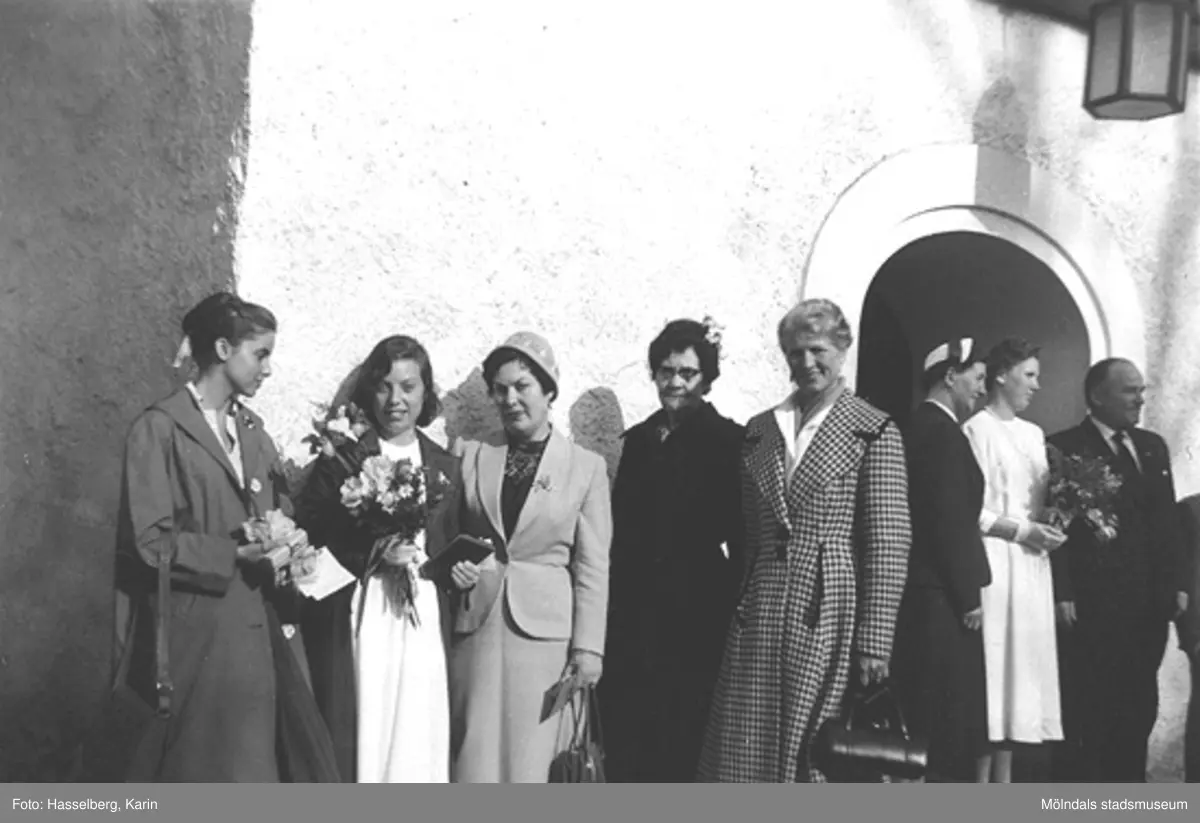 Konfirmander från, Skolhemmet Stretered, med föräldrar utanför Kållereds kyrka, 1958.
