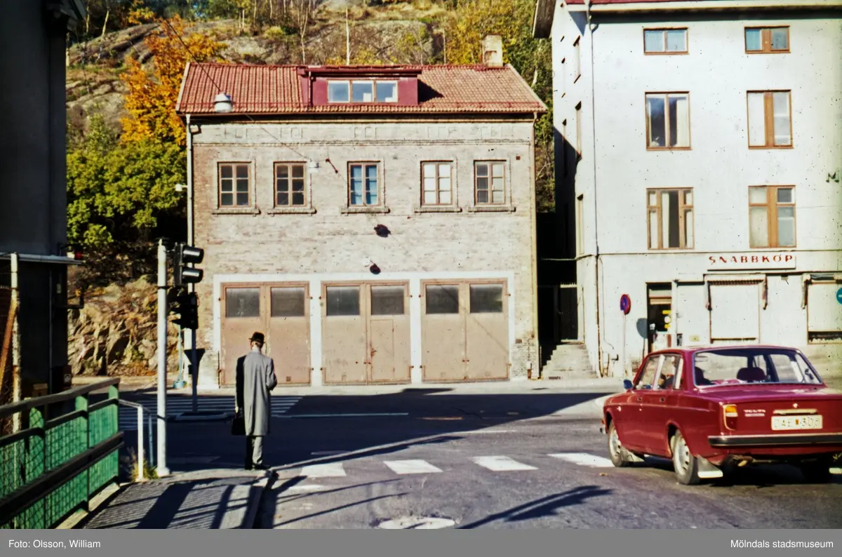 Rakt fram ligger brandstationen (tidigare: Viktualieföreningens affär) påp Gamla Torget 41. Till höger om denna ses Mölndals gamla stadshus (senare Kulturskola och Musikskola) på Gamla Torget 43. Till höger ses en röd Volvo 142 som är på väg från Forsebron ut på Kvarnbygatan. Okänt årtal.