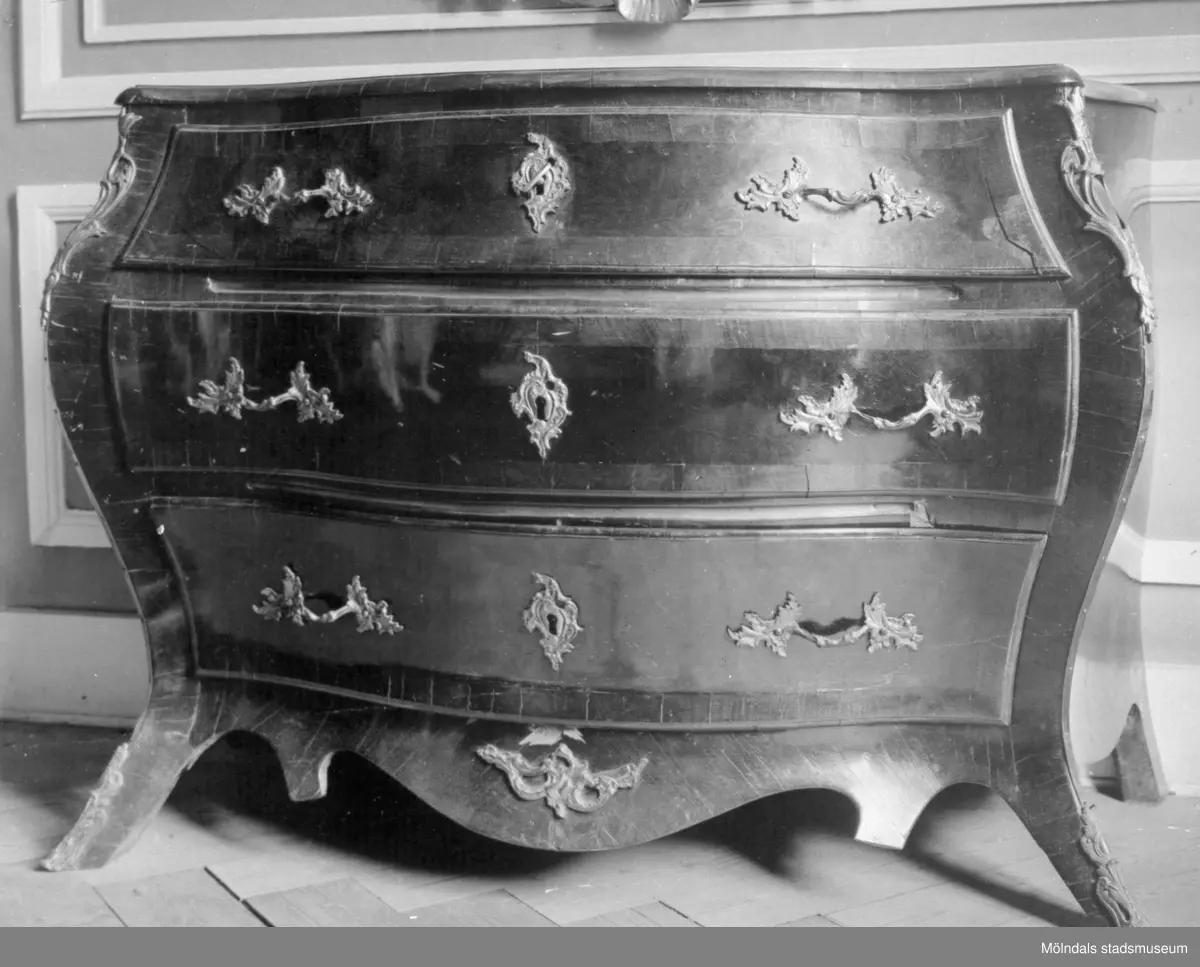 Rokokobyrå av mörkt träslag med mässingsbeslag, tre lådor och utfasat mittenparti. Gunnebo slott 1930-tal.