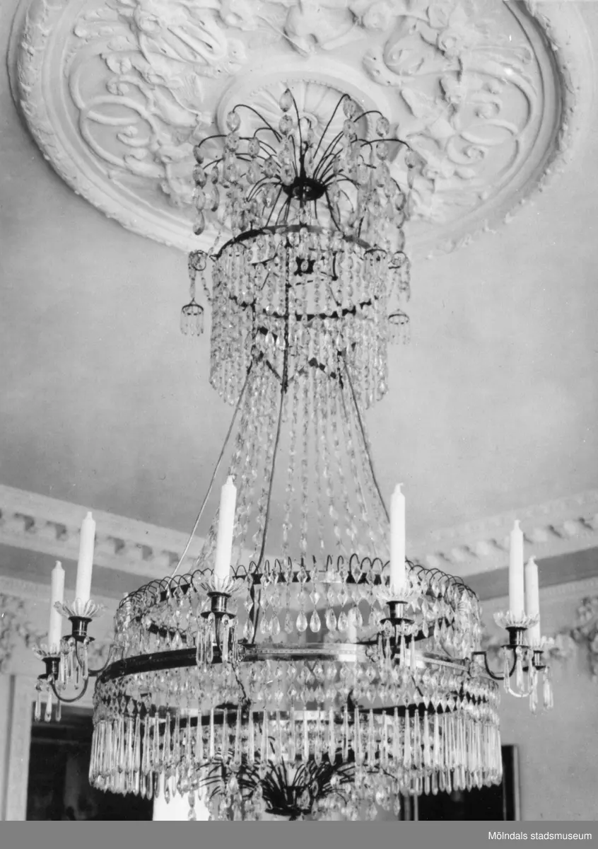 Takkrona med slipade kristallprismor och plats för ljus. Gunnebo slott, 1930-tal.