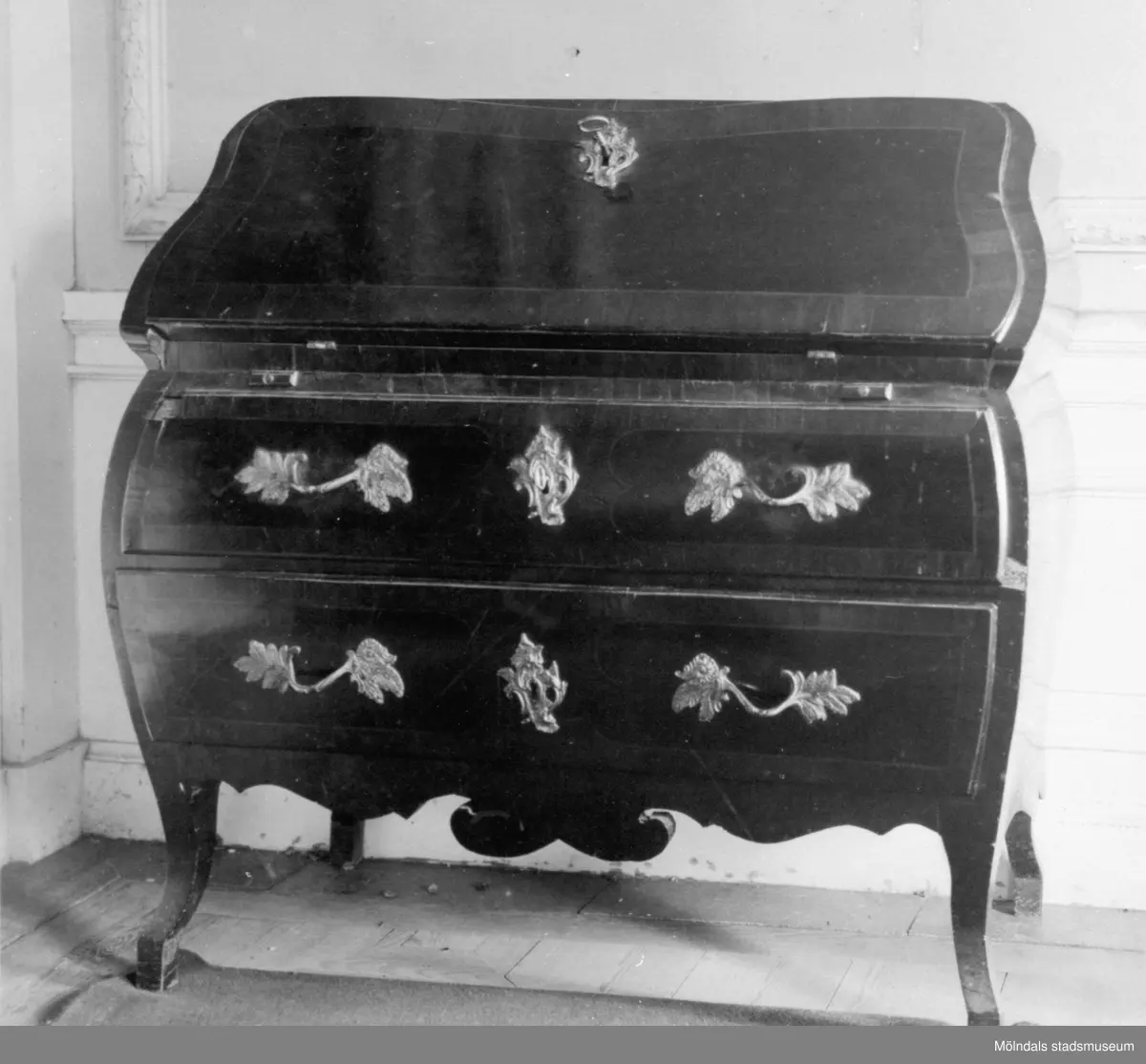 Byrå av mörkt träslag med mässingsbeslag, två lådor och framåtlutande överdel. Gunnebo slott 1930-tal.