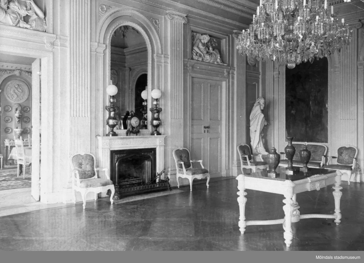Stora salongen på Gunnebo slott. I förgrunden står ett bord med tre urnor på. I bakgrunden till vänster finns en öppen spis samt några stolar. Till höger om spisen, ovanför dubbeldörren sitter dörröverstycket "Trädgårdsodling" och i bildens mitt står statyn "Vintern" av Gioacchino Frulli (1766-1801).