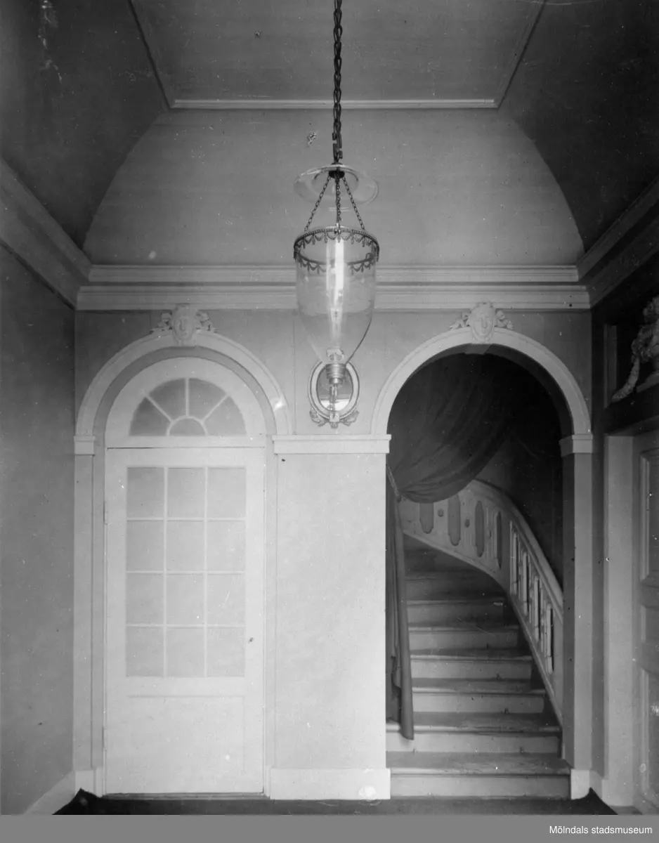 Östra förstugan på huvudvåningen med dörr till Lönntrappan till vänster och Lilla trappan till höger. Taklykta med blåst glaskupa och metallbeslag med plats för ett ljus. Gunnebo slott 1930-tal.