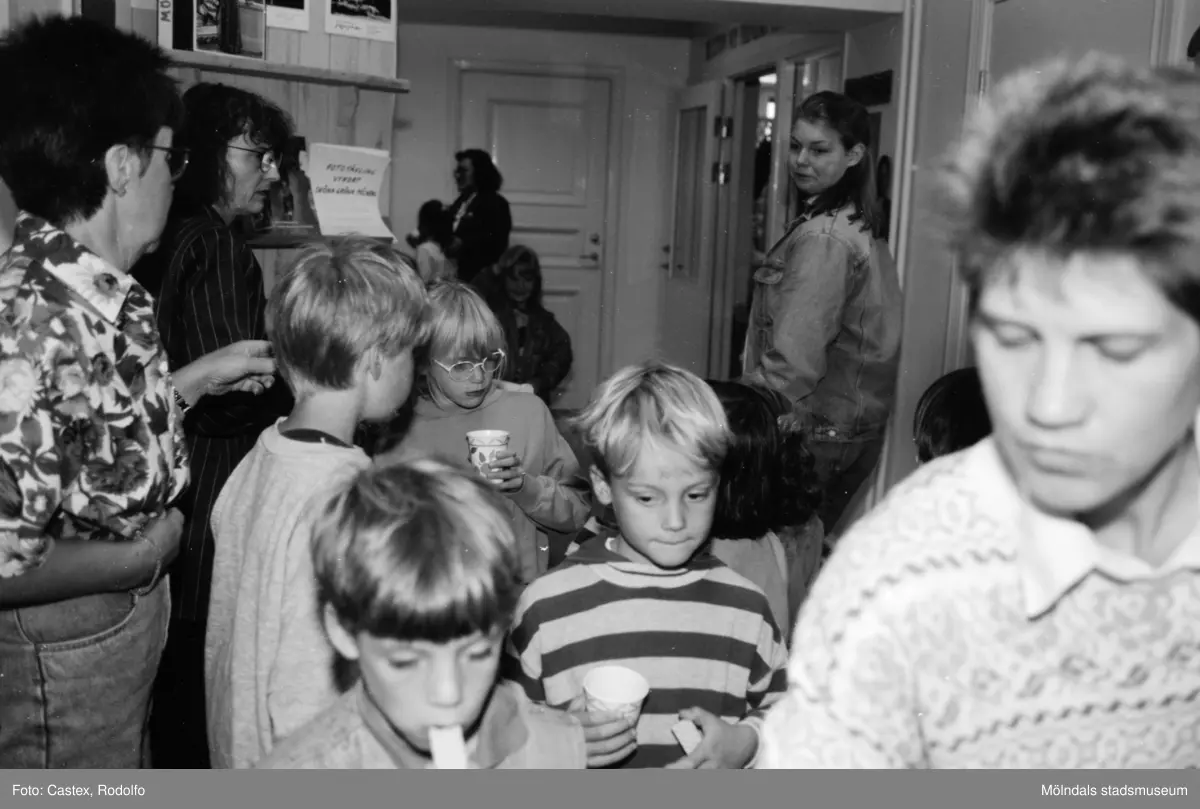Barn och vuxna som står i entrén till Mölndals museum. Det är fikapaus och barnen dricker ur muggar eller äter kex. Utställningsvernissage av och om Katrinebergs daghem på Mölndals museum 1993-09-10.