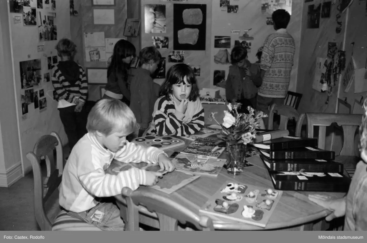 Två barn sitter och pysslar vid ett bord. I bakgrunden syns barn och en vuxen som tittar på uppsatta saker på en vägg. Utställningsvernissage av och om Katrinebergs daghem på Mölndals museum 1993-09-10.