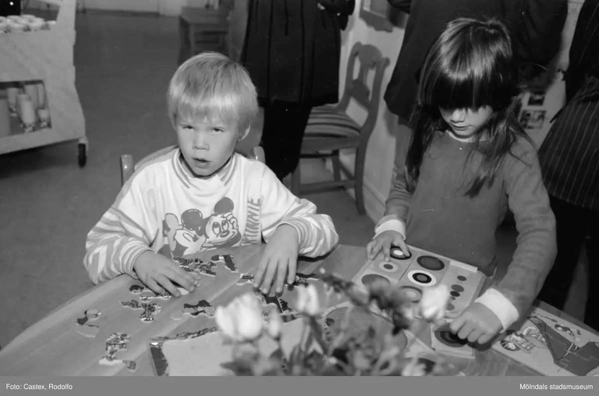 Två barn som sitter och pysslar vid ett bord. Utställningsvernissage av och om Katrinebergs daghem på Mölndals museum 1993-09-10.