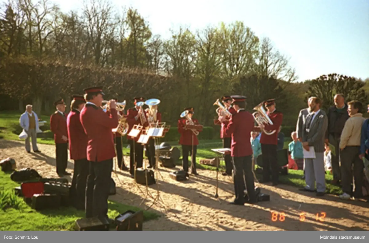 Frälsningsarméns blåsorkester (soldater) spelar inför publik, utomhus vid Gunnebo slott.