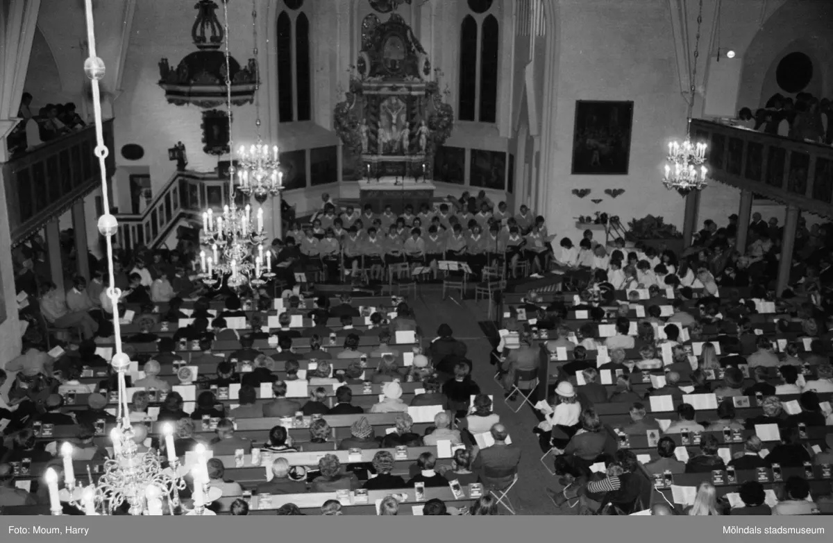 Sju körer sjunger julsånger vid "Julens sånger i centrum" i Fässbergs kyrka i Mölndal, år 1983.