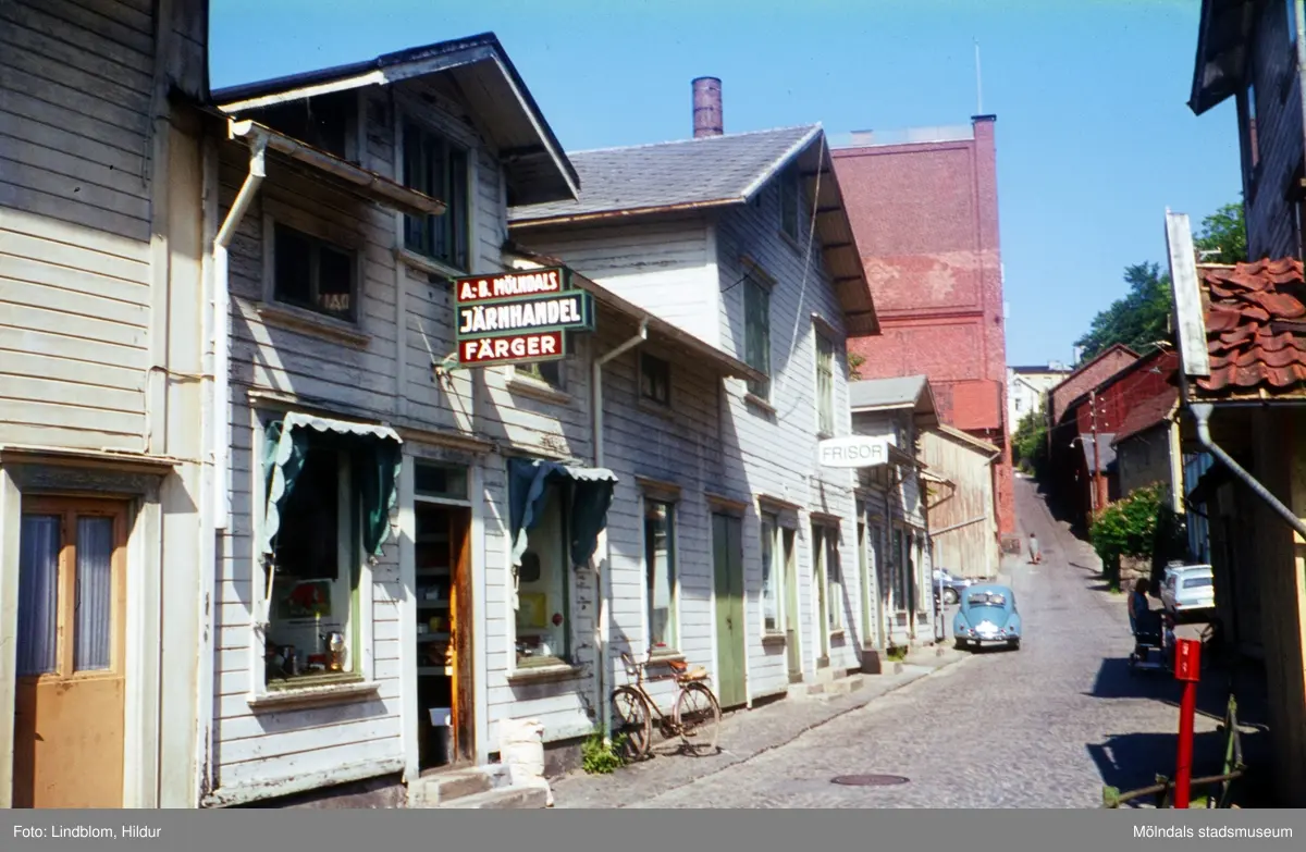 Vy från Götaforsliden i Mölndal, 1970-tal. Till vänster ses Mölndals Järnhandel samt en frisersalong i huset Götaforsliden 1-5. Lite längre upp i backen på vänster sida ses även Stora Götafors.