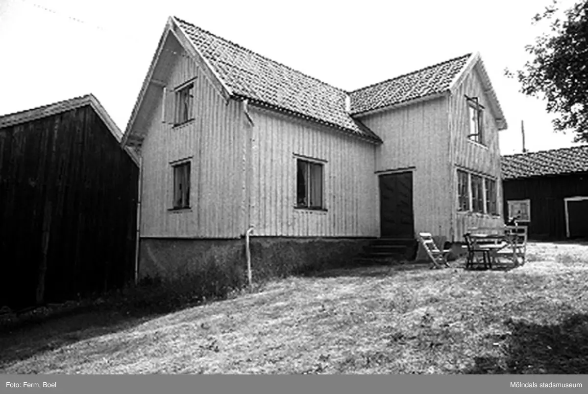 Bostadshus med ekonomibyggnader runt omkring. Högen 2:1/2:2 i Kållered, 1992-06-30.