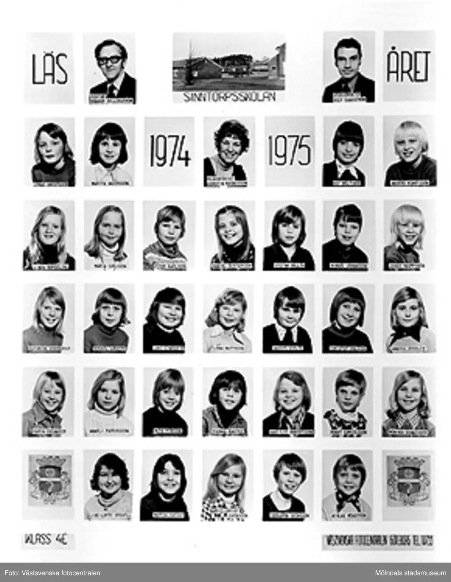 En bildkarta med skolfoton på klass 4E i Sinntorpsskolan, läsåret 1974/1975. Bildkartan är uppklistrad på ett fotoark i en pärm (MM23916) från Brattås rektorsområde, tillsammans med andra skolfoton MMF2004_1484-1522.