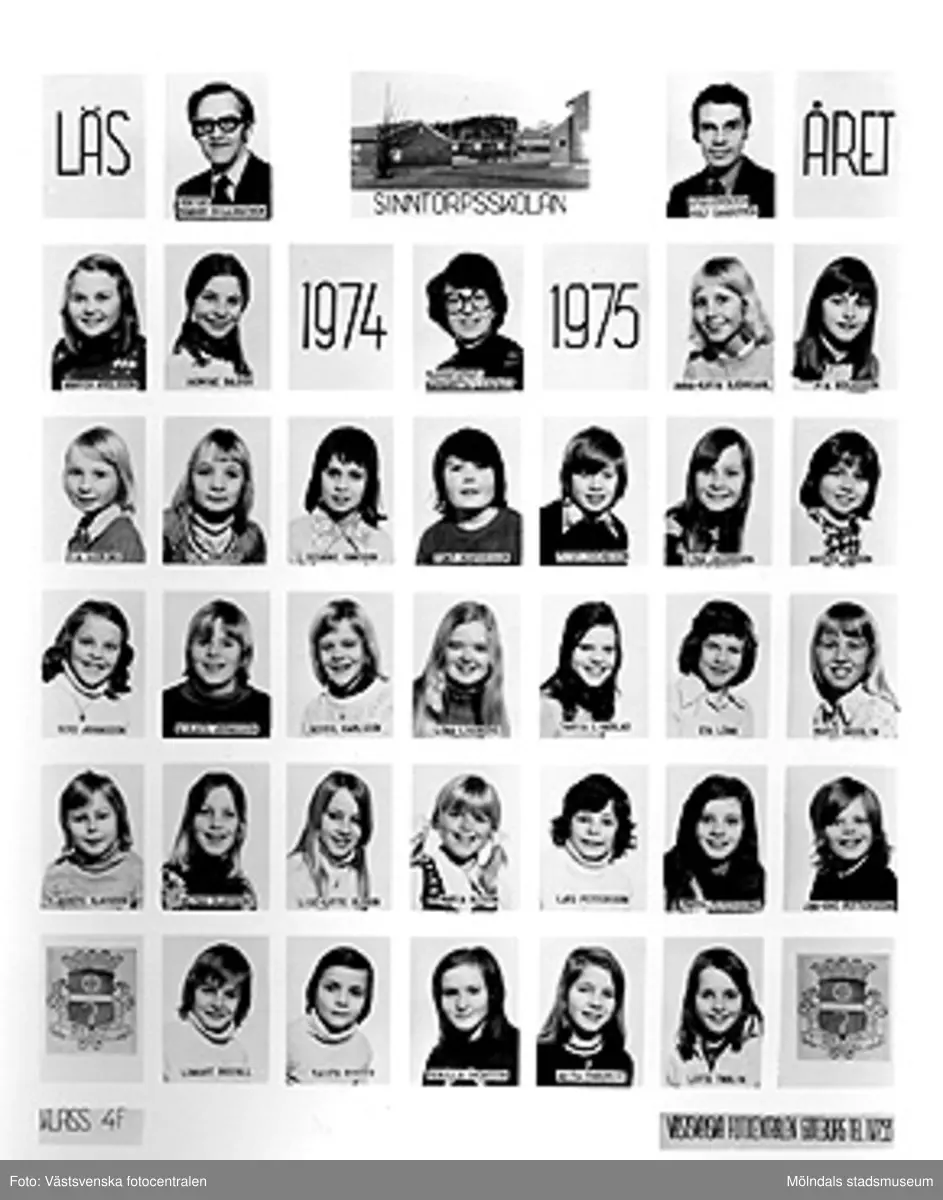 En bildkarta med skolfoton på klass 4F i Sinntorpsskolan, läsåret 1974/1975. Bildkartan är uppklistrad på ett fotoark i en pärm (MM23916) från Brattås rektorsområde, tillsammans med andra skolfoton MMF2004_1484-1522.
