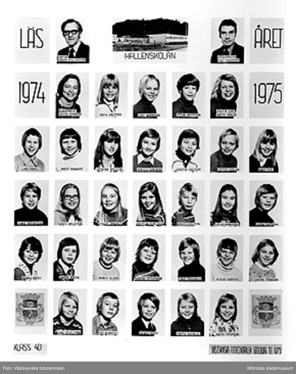 En bildkarta med skolfoton på klass 4D i Hallenskolan, läsåret 1974/1975. Bildkartan är uppklistrad på ett fotoark i en pärm (MM23916) från Brattås rektorsområde, tillsammans med andra skolfoton MMF2004_1484-1522.