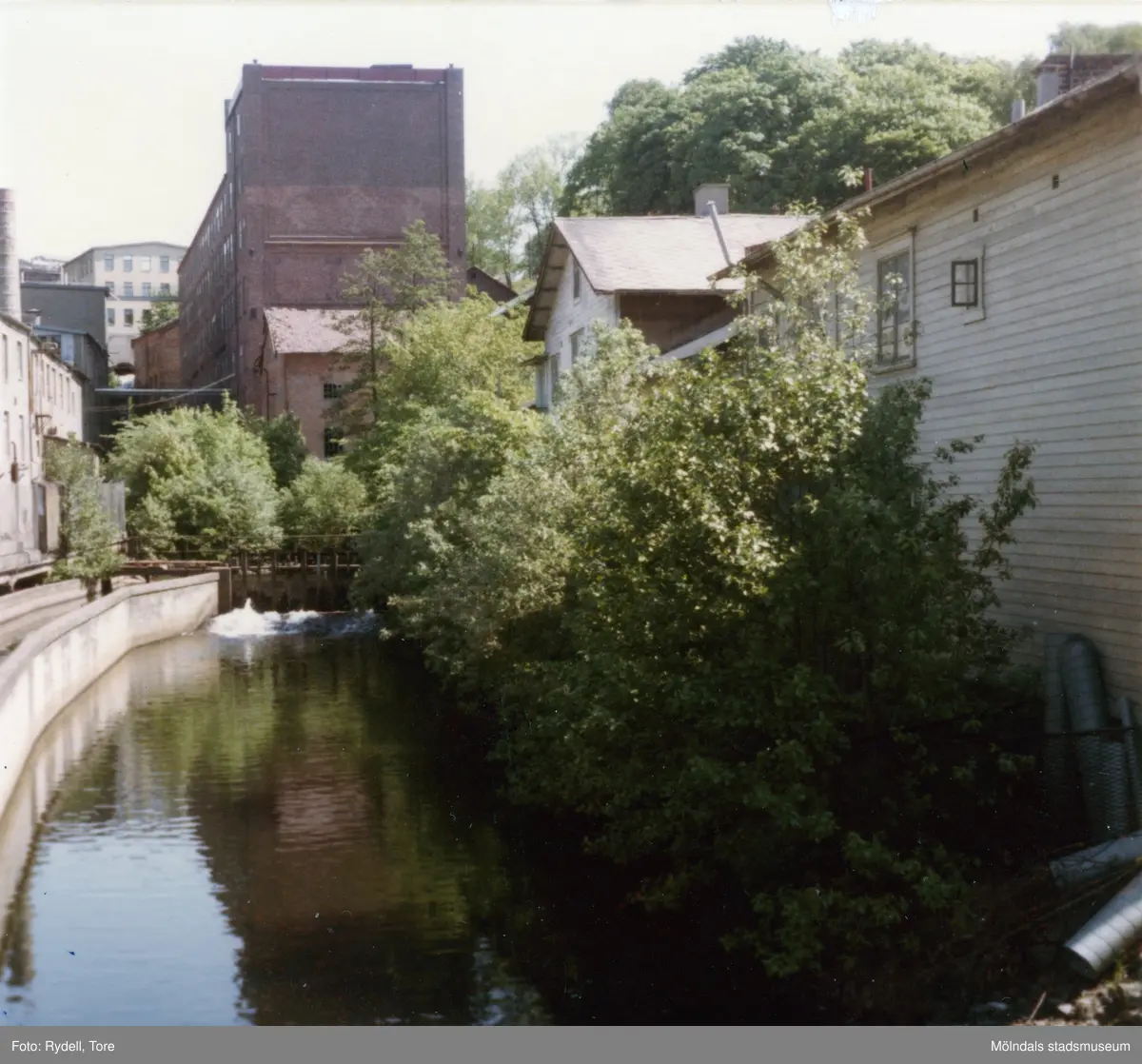 Mölndalsfallen utanför huset Götaforsliden 1-5 i Mölndals Kvarnby på 1980-talet. Vy från Forsebron mot Nymans kvarn och Stora Götafors.