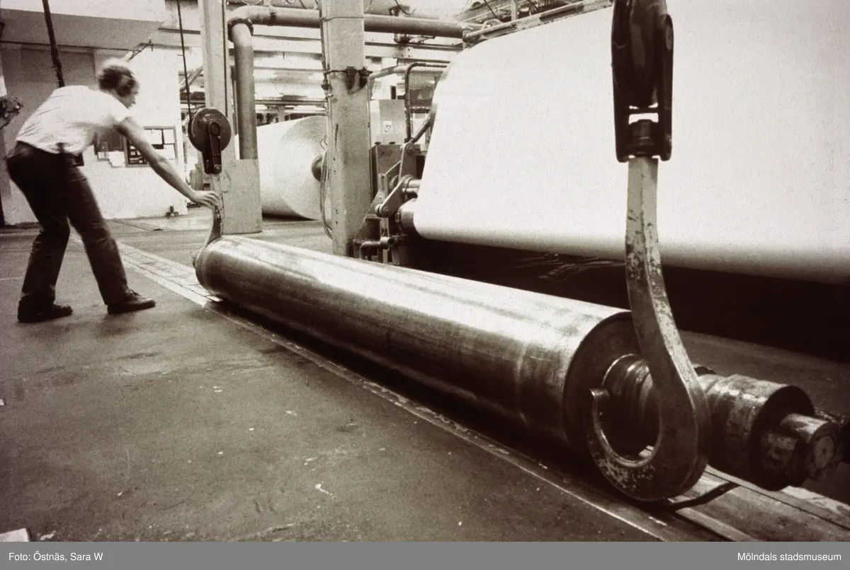 Jan Callesen byter kartongrulle på Papyrus i Mölndal, år 1990.