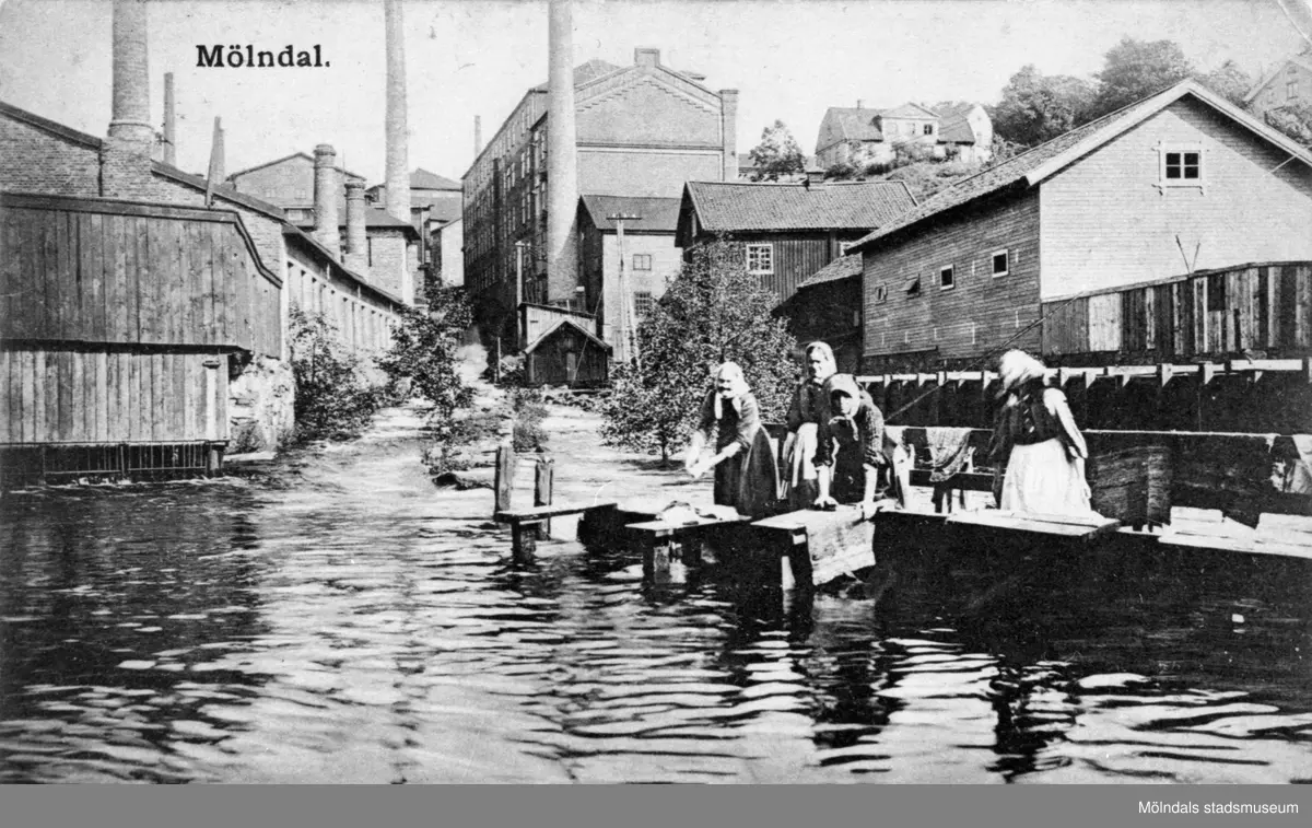 Vykort "Mölndal" postat 23/5 1915. Kvinnor som skurar/tvättar mattor i Mölndalsfallen strax uppströms Forsebron. I bakgrunden ses från vänster: Delbancos oljeslageri, Stora Götafors (Götaforsliden 13, Kvarnfallet 22-23), Kvarnfallet 24 (Nymans kvarn), Kvarnfallet 25 och Omnibuss-Johans stall.