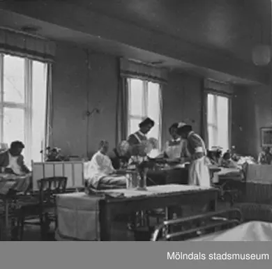 Tre sjuksköterskor delar ut mat på Sabbatsbergs sjukhus i Stockholm,