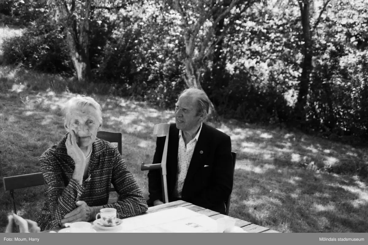 Lindome Hembygdsgille firar 20-årsjubileum på Börjesgården i Hällesåker den 23 juli år 1983. En kvinna och en man i trädgården.