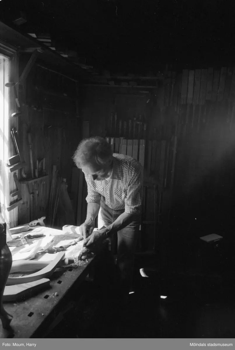 Lindome Hembygdsgille firar 20-årsjubileum på Börjesgården i Hällesåker den 23 juli år 1983. Snideriarbete i snickarboden.