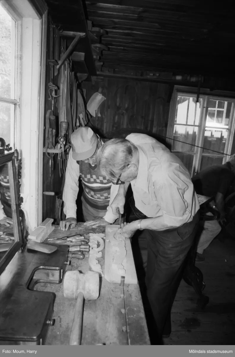 Lindome Hembygdsgille firar 20-årsjubileum på Börjesgården i Hällesåker den 23 juli år 1983. Snideriarbete i snickarboden.