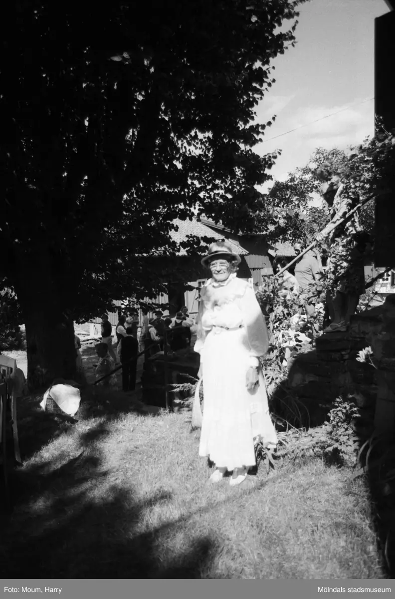 Lindome Hembygdsgille firar 20-årsjubileum på Börjesgården i Hällesåker den 23 juli år 1983. "Alice Karlsson som Mamsell Therese i vit klänning från sekelskiftet med tillhörande stråhatt."