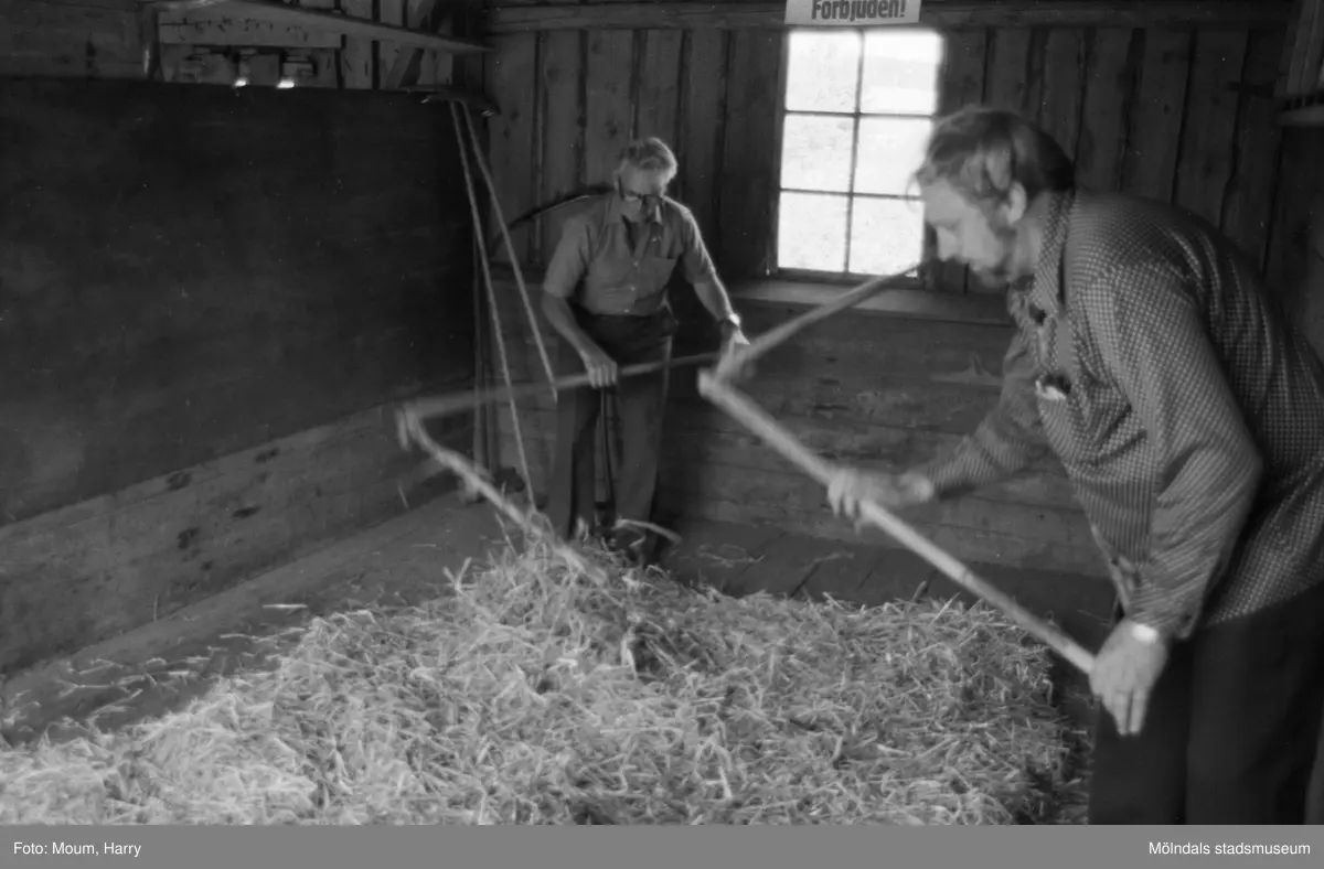 Lindome Hembygdsgille firar 20-årsjubileum på Börjesgården i Hällesåker den 23 juli år 1983. Sven i Hegna (Zackrisson) och Karls Tage (Larsson) prejlar.