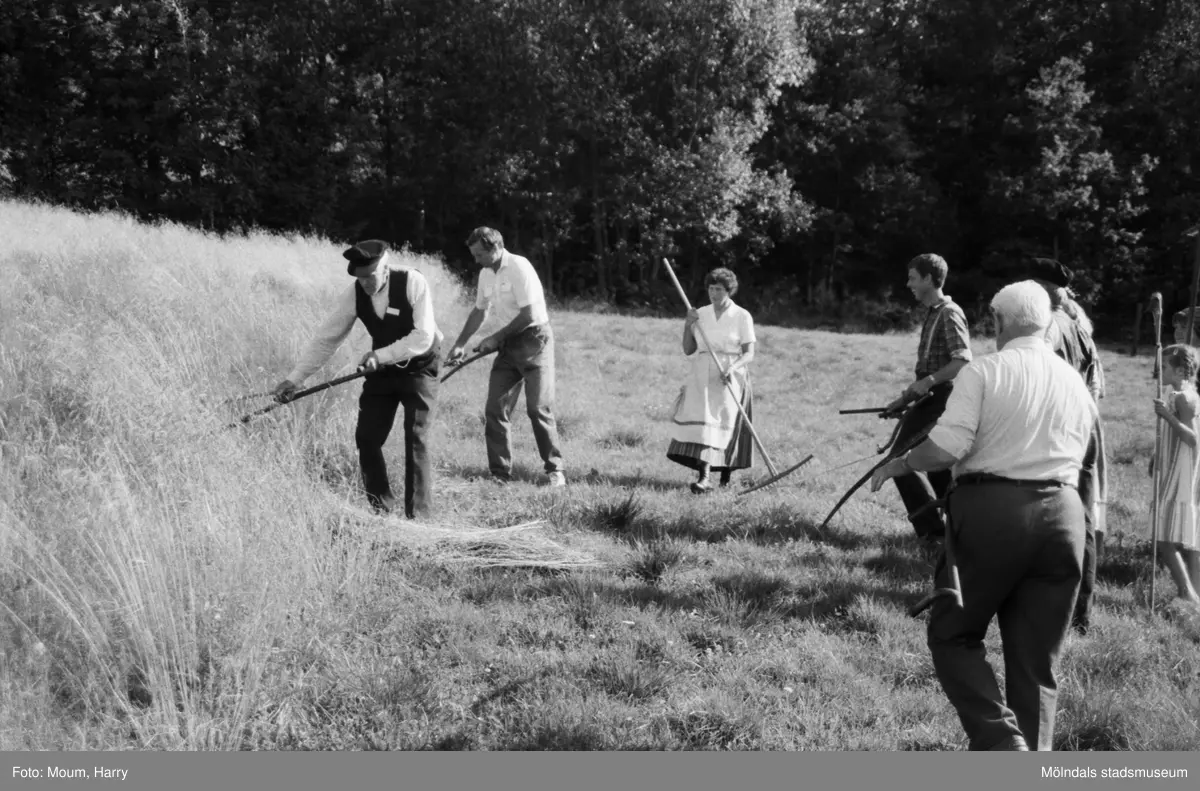 Lindome Hembygdsgille firar 20-årsjubileum på Börjesgården i Hällesåker den 23 juli år 1983. Slåtter med lie samt räfsning.