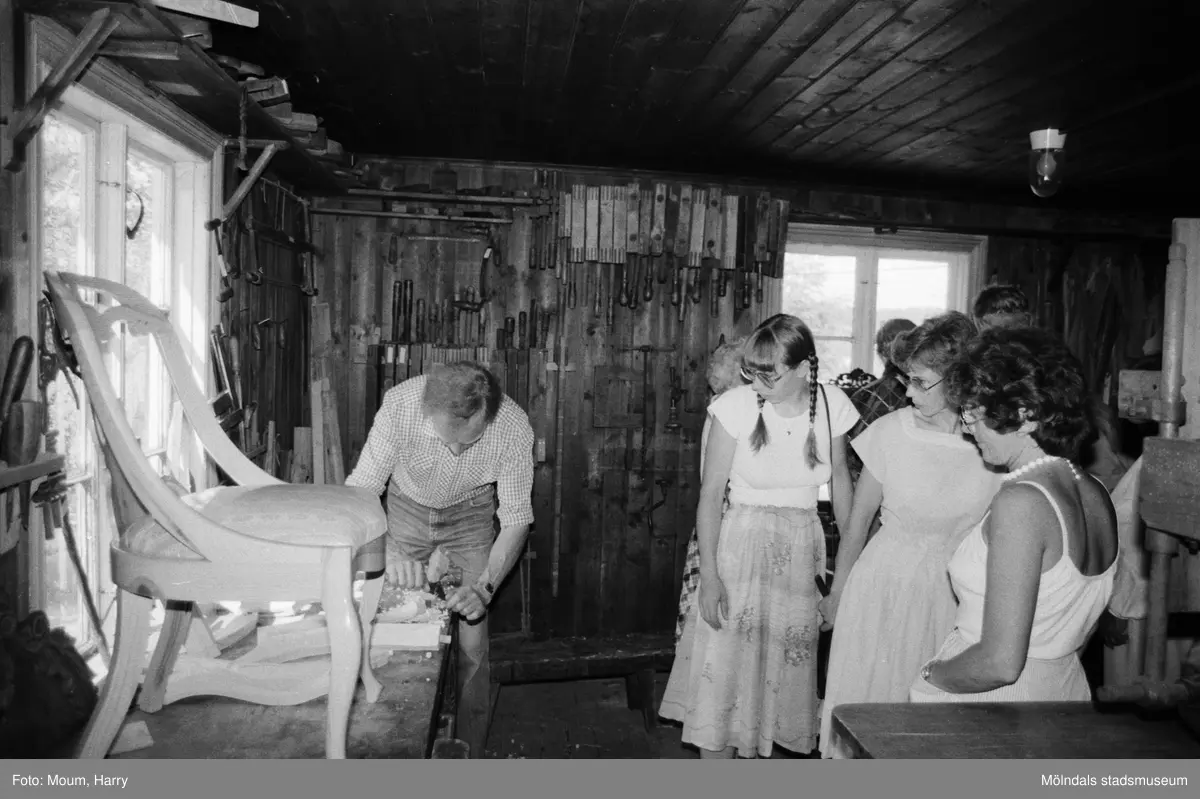 Titel: Lindome Hembygdsgille firar 20-årsjubileum på Börjesgården i Hällesåker den 23 juli år 1983. Snideriarbete i snickarboden. För mer information om bilden se under tilläggsinformation.