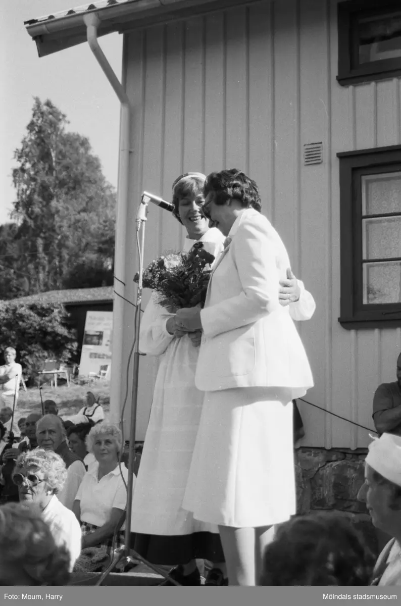 Lindome Hembygdsgille firar 20-årsjubileum på Börjesgården i Hällesåker den 23 juli år 1983. "Stora famnen bjöd Gillets ordförande Solveig Karlsson kulturnämndens ordförande Maj Pettersson."