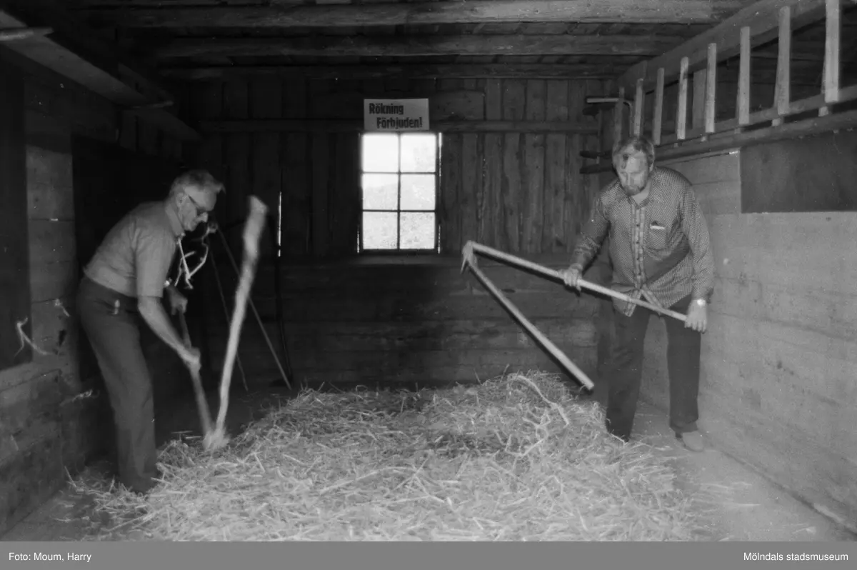 Lindome Hembygdsgille firar 20-årsjubileum på Börjesgården i Hällesåker den 23 juli år 1983. "Sven i Hegna (Zackrisson) och Karls Tage (Larsson) visade publiken hur man prejlar."
