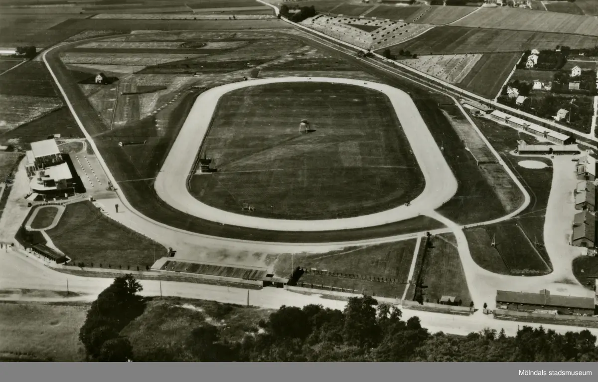 Flygfoto Åby travbana, galoppbana och steaplechasebana. Stallcafe ägaren Tora Wickmans hus till vänster innanför galoppbanan. Huset fanns på plats innan travbanan byggdes 1936, men beboddes innan Tora Wickman av Åbys banvakt.