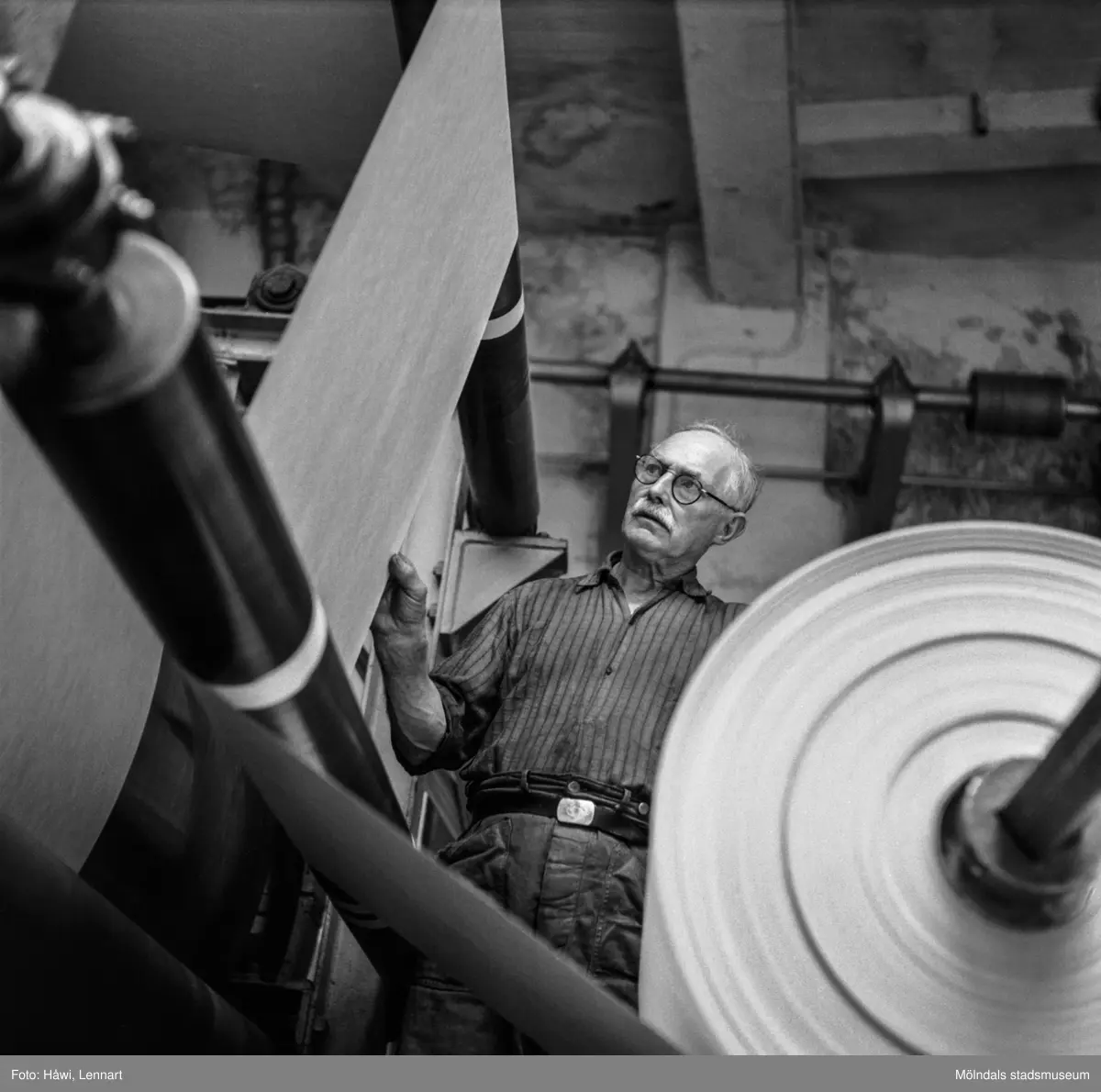 Maskinförare Edvin Andersson i arbete vid maskin på pappersbruket Papyrus i Mölndal, 15/6 1955.
