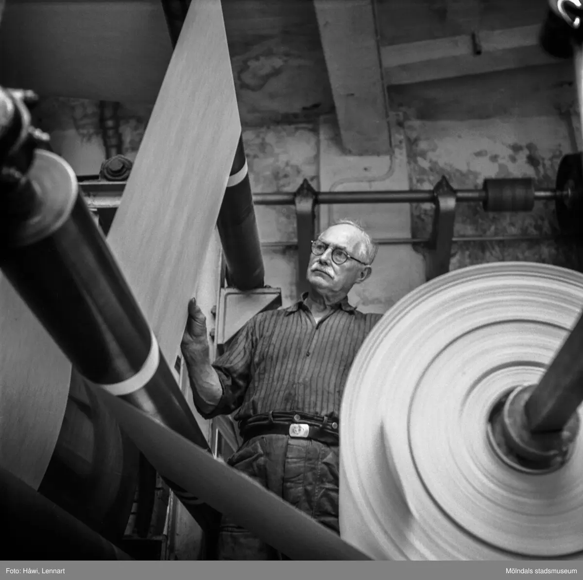 Maskinförare Edvin Andersson i arbete vid maskin på pappersbruket Papyrus i Mölndal, 15/6 1955.