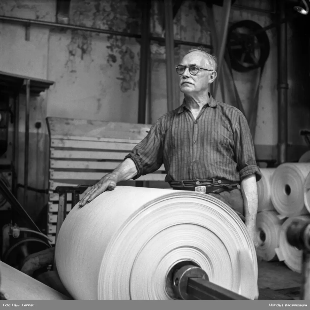 Maskinförare Edvin Andersson i arbete vid maskin på pappersbruket Papyrus i Mölndal, 15/6 1955.