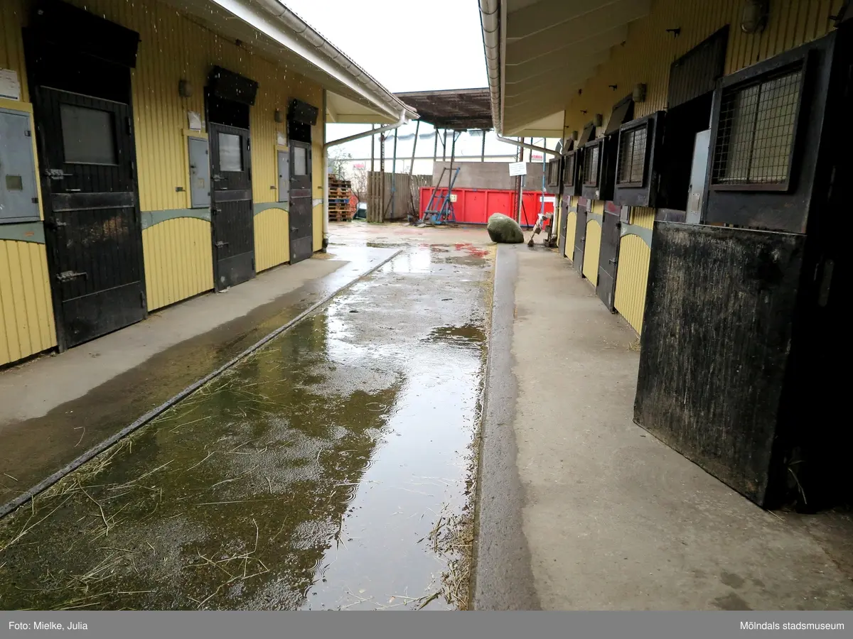 Titel: Åby Stallgårdar och närliggande stallar i Balltorp 2015. Uteboxar Åby Stallgårdar, Lunnagårdsgatan 10. 1992 utökade travbanan sin verksamhet med Åby Stallgårdar i Balltorp där det fanns 70 boxar. I juni 1998 påbörjades bygget utav Stallgårdar ll som bestod utav 42 boxar. I samband med dokumentation utav Åby Stallbacke 2015.