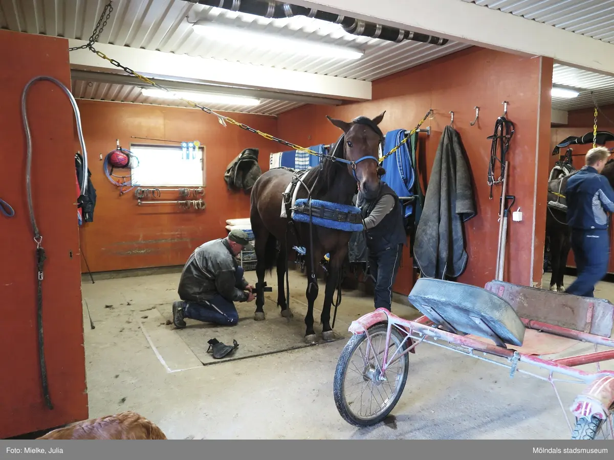 Åby Stallgårdar och närliggande stallar i Balltorp 2015. Interiör och selning inför träning, Lunnagårdsgatan 10.