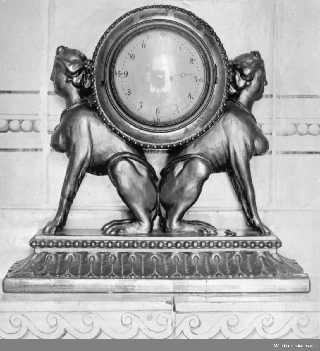 Bordspendyl som på varje sida bärs upp av figurer med kvinnlig överkropp och sittande djurkropp. Gunnebo slott 1930-tal.