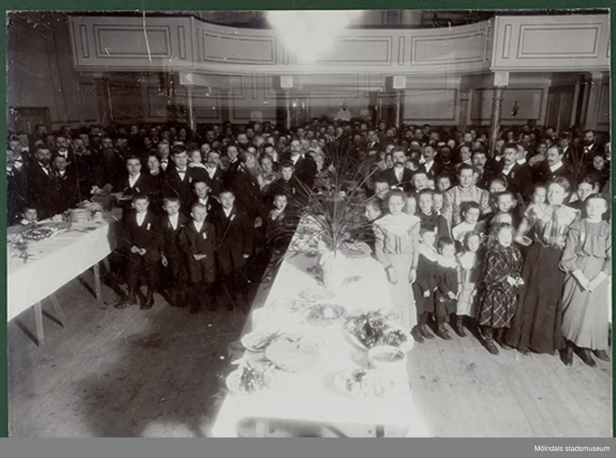 Papyrusanställda med familjer på fest i Gamla stadshuset, Kvarnbygatan 43 i Kvarnbyn. Trettondagen 1906.