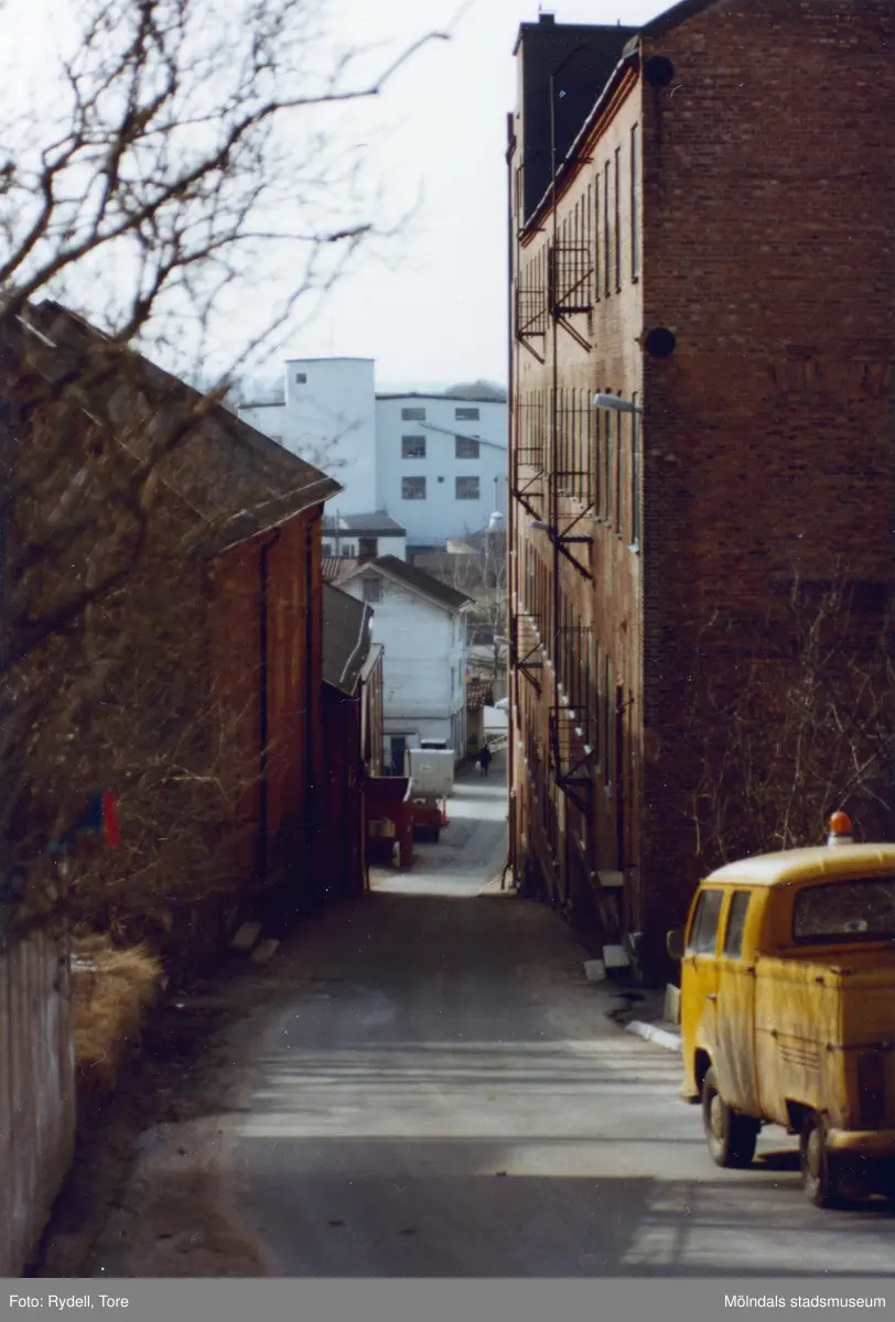 Götaforsliden i Mölndals Kvarnby i riktning mot väster på 1980-talet. På vänster sida gatan ses närmast Götaforsliden 14 och på höger sida Stora Götafors. Längst ned i backen ses på vänster sida även gaveln till huset Götaforsliden 6. I bakgrunden ses byggnad tillhörande pappersbruket Papyrus.