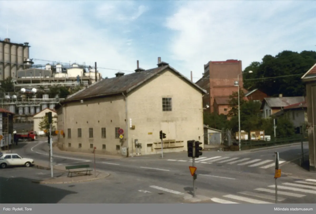 Vy från Gamla Torget i Mölndals Kvarnby mot industribyggnaden Kvarnbygatan nr 6, 1970-tal. Upp till vänster ses Soabs silotorn och till höger Stora Götafors samt Forsebron.