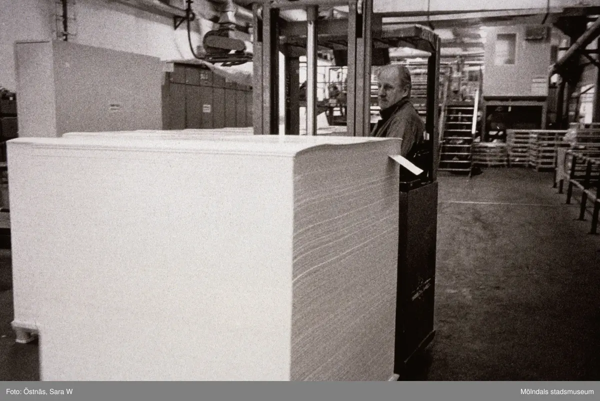Arne Larsson transporterar kartongpall med truck på Papyrus i Mölndal, år 1990.