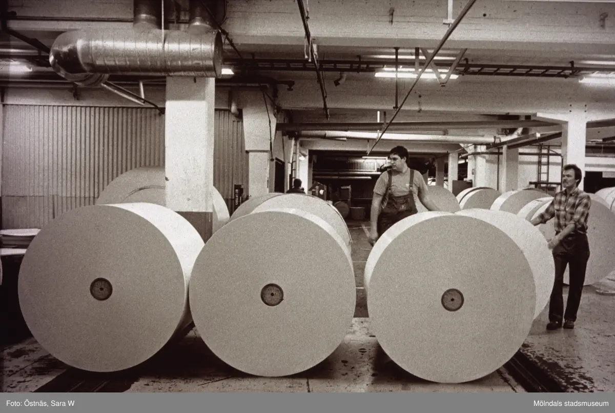 Stefan Roslund och Lennart Landh i arbete med kartongrullar på Papyrus i Mölndal, år 1990.